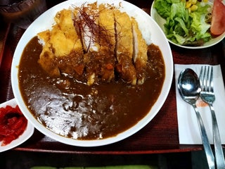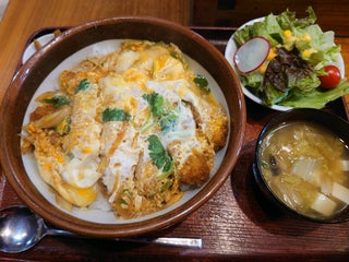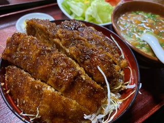 信濃大町駅から徒歩3分。ソースかつ丼は漬物、味噌汁、サラダもついて850円。清涼飲料やアルコール類を一切置いてないのも特徴。