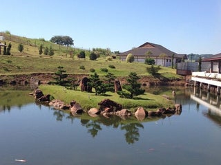 Clima agradável, cerejeiras, cachoeira artificial e lindas carpas coloridas com caminhos e pedras para atravessar. Conta com um quis que grande!