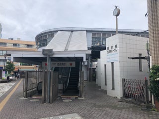 駅前にベンチと公衆トイレ、交番がある